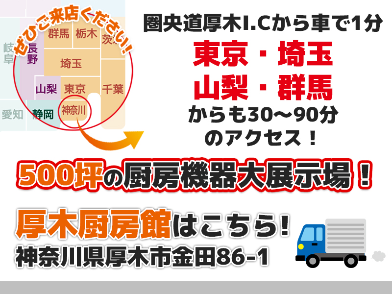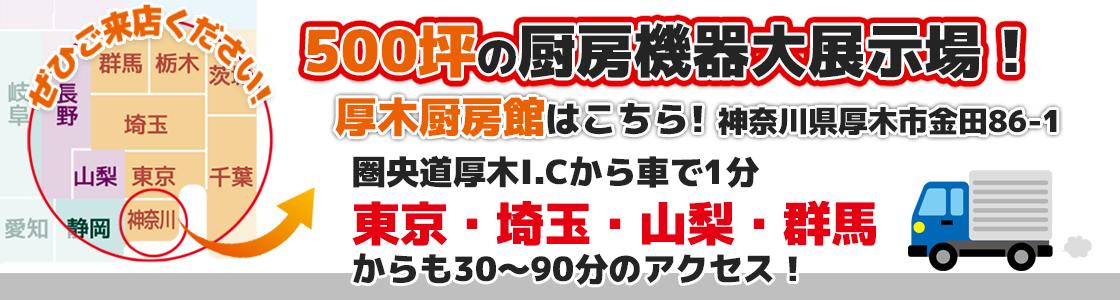 129号線の厚木市金田に、500坪の大型倉庫とケイツー厨機の店舗がございます。厨房機器はもちろん、飲食店用のテーブル、イス、照明、小物用品、什器など、数多くの商品を取り揃えております。