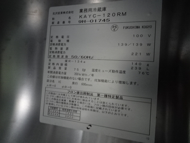CT0307RV@2019年製★キタザワ(フクシマ)★冷蔵コールドテーブル★KAYC-120RM★W1200×D600★100V★厨房専門店