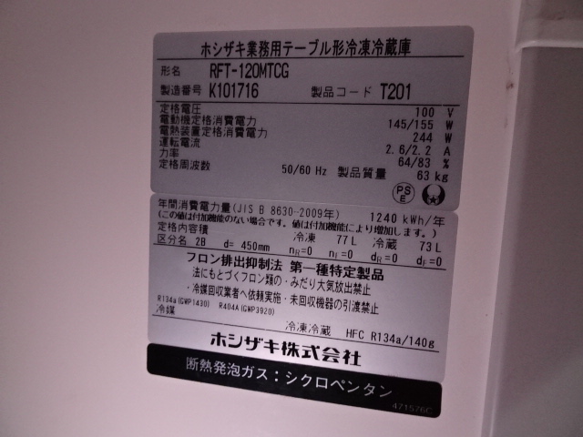 ●商品名:CT1120RG@2020年製★ホシザキ★冷凍冷蔵コールドテーブルw1200★W1200xD450xH800★RFT-120MTCG★100V★63kg★厨房専門店