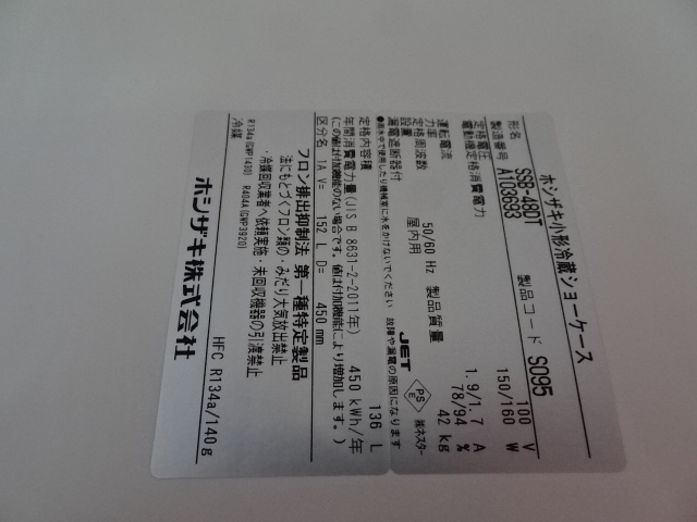 ●商品名:RS1120RQ@2021年製★ホシザキ★冷蔵ショーケース★W485xD450xH1410★100V★42kg★SSB-48DT★厨房専門店