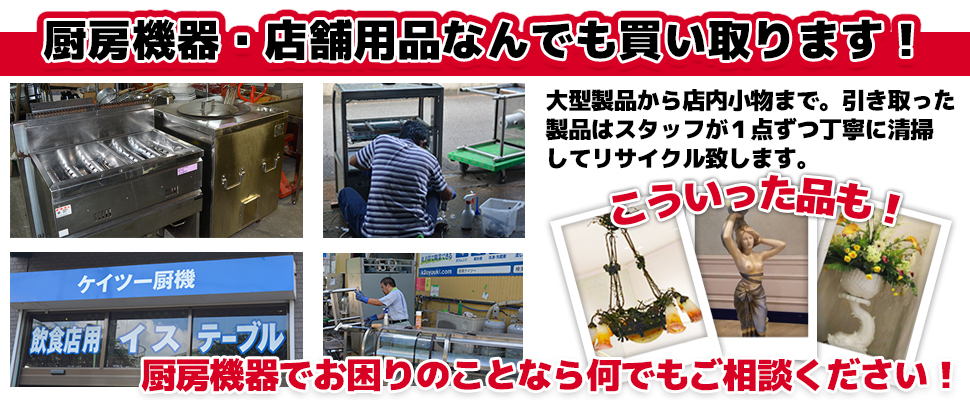 厨房機器専門スタッフもおりますので、購入から入れ替え、また居ぬきでの飲食店運営や、買取のご相談にも応じます。まずはお気軽にご相談くださいませ!