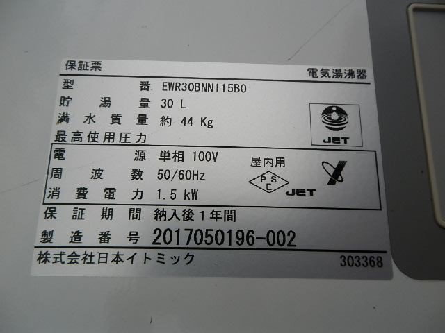 EA139Q@2017年製★イトミック電気湯沸器W360xD270xH750★100V★EWR30BNN115B0